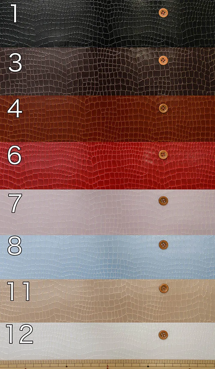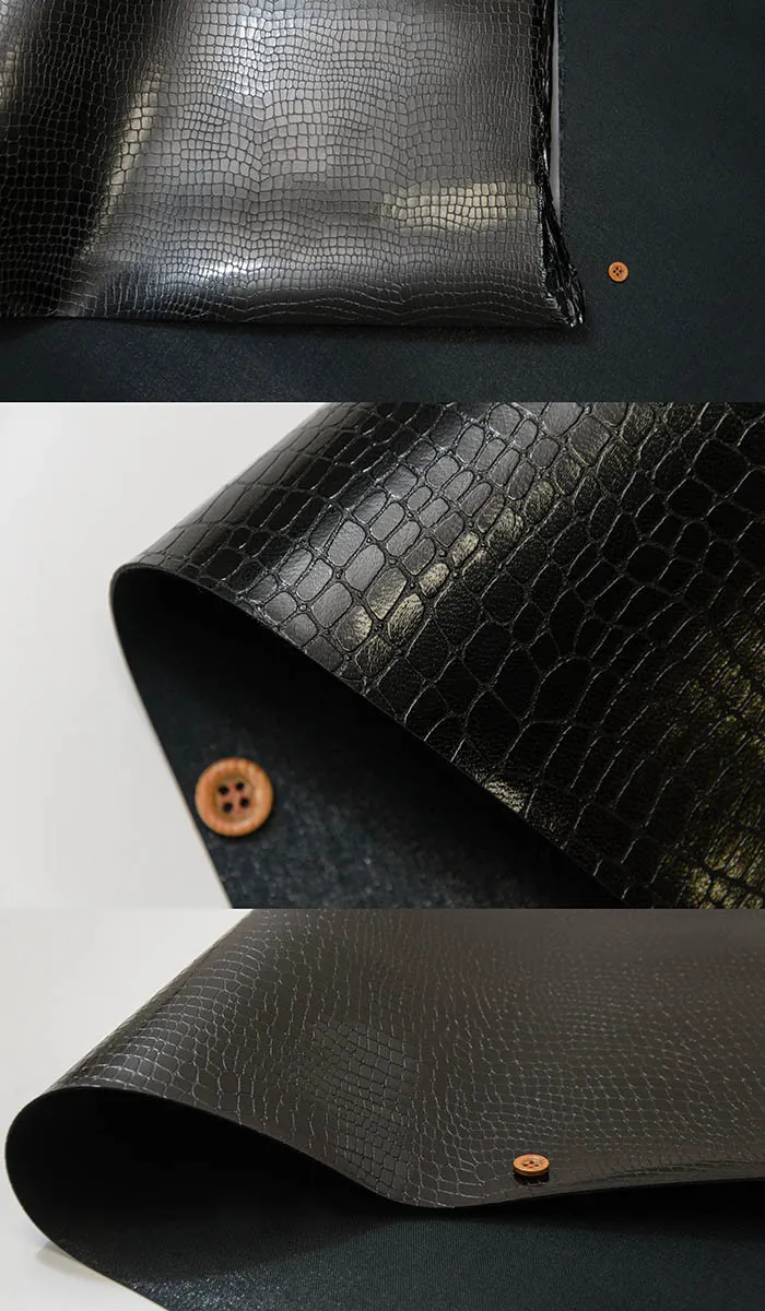 エナメルのように光沢がありますが、表面にクロコダイルのような凹凸を付けた、型押しレザー風の合皮生地。