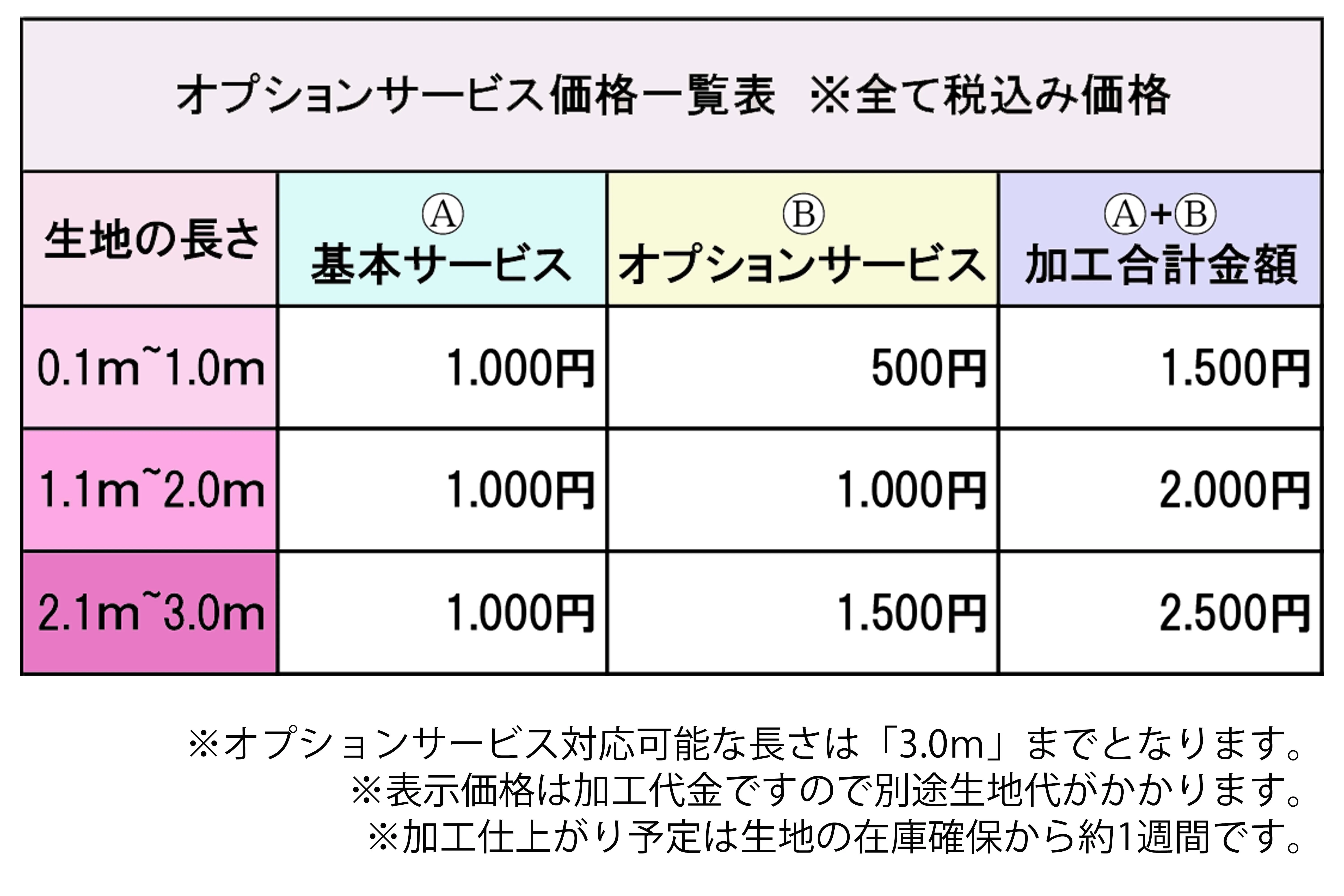 ※表示価格は1枚の加工代金となります。合わせて生地代金がプラスされます。