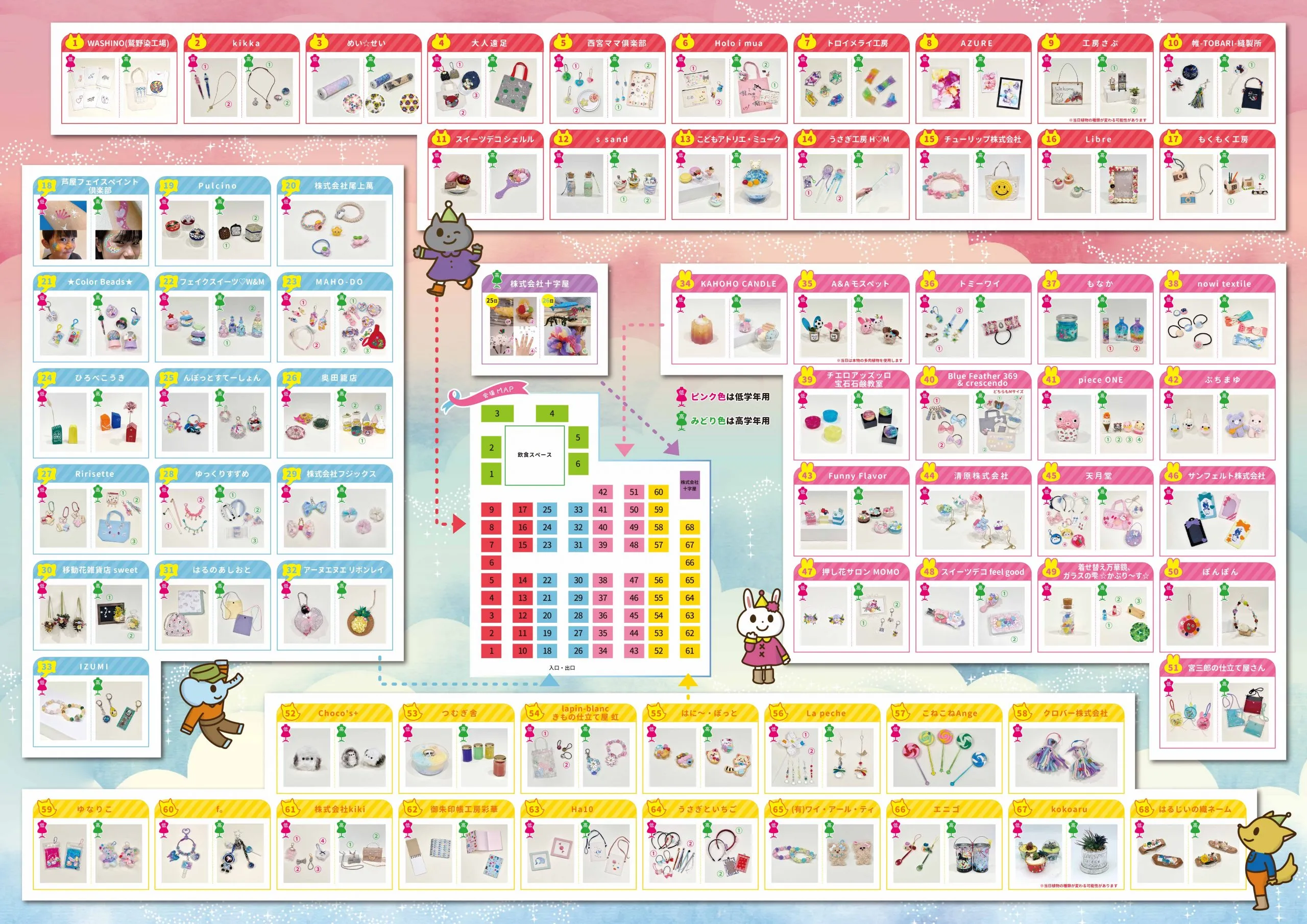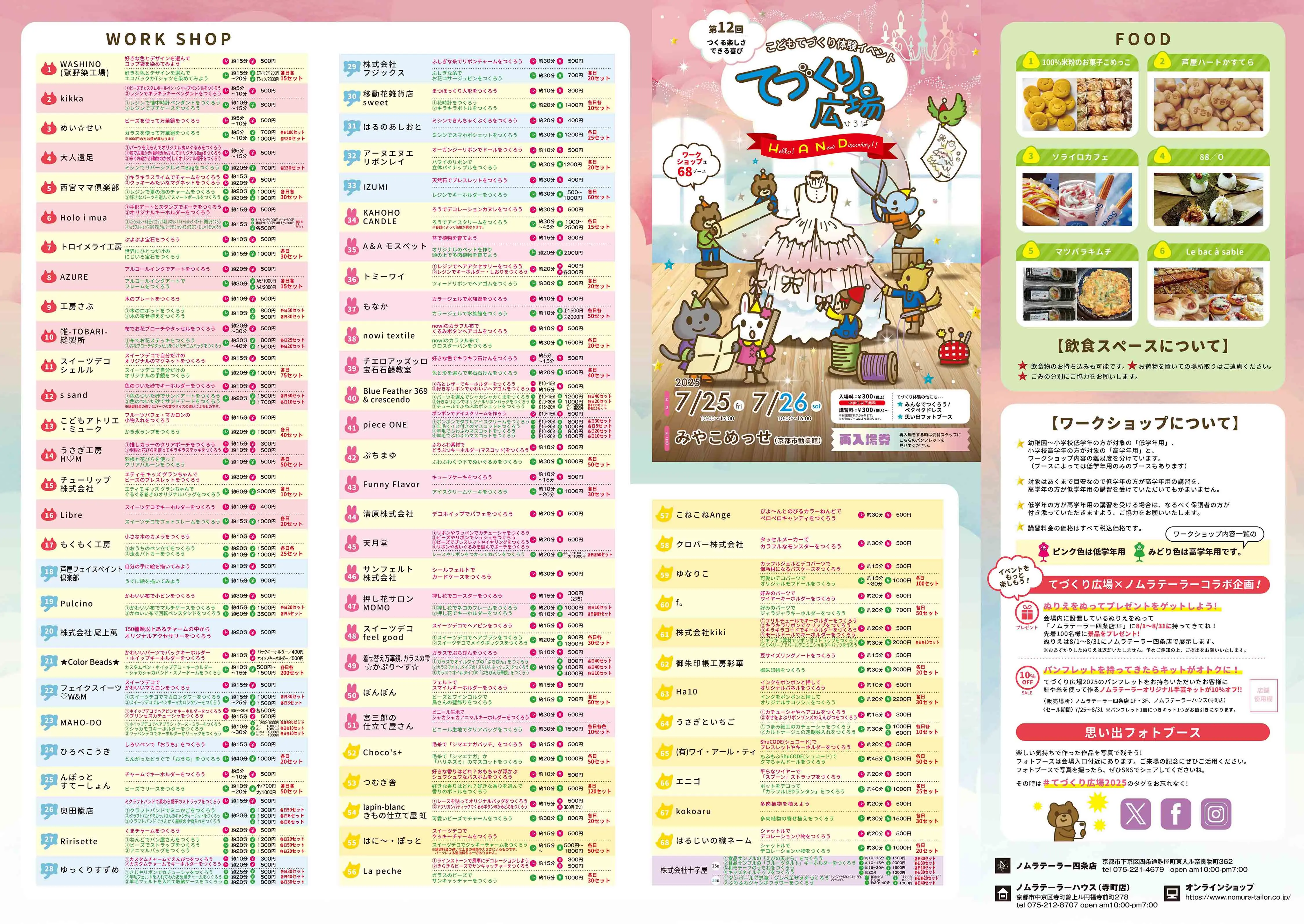 当日パンフレットが完成しました! 2025.07.18 てづくり広場2025のパンフレットが完成しました☆ さっそく大公開です☺ メインビジュアルを模したデザインになっています✨ 事前にパンフレットをチェックしたい方は下記のリンクからダウンロードしてください。パンフレット表面 パンフレット内面詳しいブース内容は「出店内容」に掲載しておりますので、あわせてご覧ください。出店情報はこちら! 当日はワークショップ以外にも企画が盛りだくさんです!詳しくはこちらをご覧ください。 今年もみなさんで手作りを楽しみましょう☆