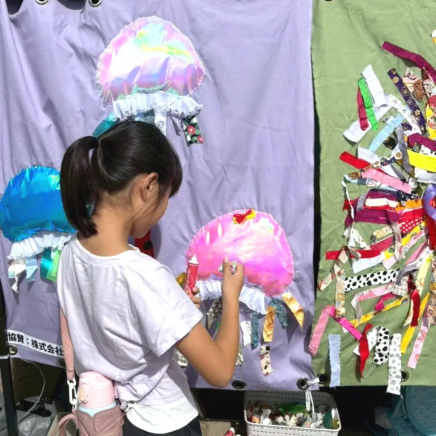 今回はクラゲのペタペタタペストリーを作成し、こどもたちに作ってもらいました。